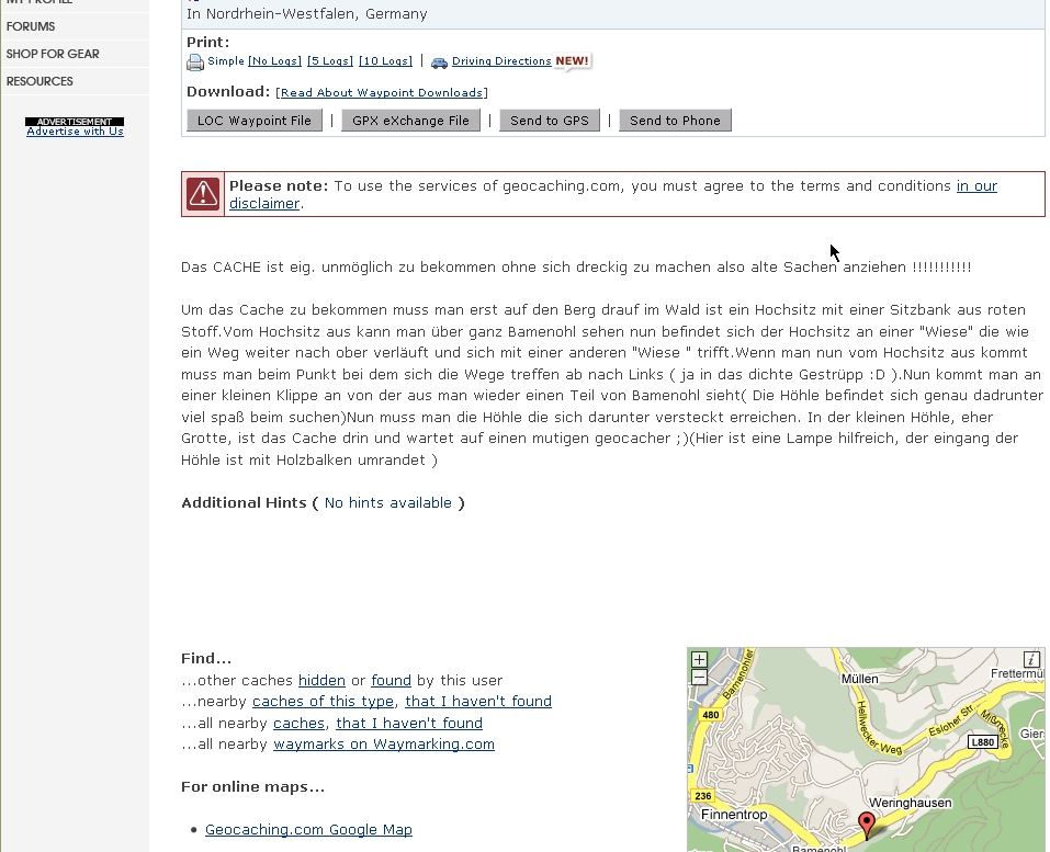 Ich bin häufiger auf der Suche nach Caches in der Umgebung meines alten Heimatdorfes und musste o.g. Beschreibung lesen. Über die Qualität der Caches dieses Owners steht genug in den Logs. Leider!